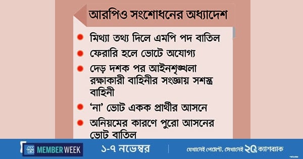 এর আগে ২৩ অক্টোবর উপদেষ্টা পরিষদের বৈঠকে আরপিও সংশোধন অধ্যাদেশের খসড়ার নীতিগত অনুমোদন করা হয়। এরপর জোট মনোনীত প্রার্থীকে নিজ দলের প্রতীকে ভোট করা নিয়ে বিএনপিসহ ১৩ দল আপত্তি তুললেও জামায়াত ও এনসিপি ২০ ধারার এ সংশোধন বহাল রাখার দাবি জানায়। এ নিয়ে টানাপোড়েনের মধ্যেই সেই বিধান রেখেই অধ্যাদেশ জারি করা হলো। এ ছাড়া নতুন আরপিও অনুযায়ী, সমভোট পেলে হবে পুনঃভোট, জামানতের পরিমাণ বাড়িয়ে ৫০ হাজার টাকা পুনর্নির্ধারণ, দল আচরণবিধি লঙ্ঘন করলে সর্বোচ্চ দেড় লাখ টাকা জরিমানা, আইটি সাপোর্টেড পোস্টাল ভোটিং পদ্ধতি চালু করা, এআইয়ের অপব্যবহারকে নির্বাচনি অপরাধ হিসেবে গণ্য করা এবং হলফনামায় অসত্য তথ্য (ভোটে অযোগ্য এমন) দিলে নির্বাচিত হওয়ার পরও ইসি ব্যবস্থা নিতে পারবে।
