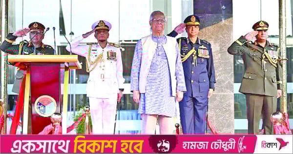 ১৯৭১ সালে যুদ্ধক্ষেত্রে বাংলাদেশ সশস্ত্র বাহিনী কীভাবে গঠিত হয়েছিল তা স্মরণ করে প্রধান উপদেষ্টা বলেন, ২১ নভেম্বর মুক্তিযোদ্ধাদের সঙ্গে মিলে যৌথ অভিযান শুরু করে সেনাবাহিনী, নৌবাহিনী ও বিমানবাহিনী- যা এখন প্রতি বছর সশস্ত্র বাহিনী দিবস হিসেবে উদযাপিত হয়। ২১ নভেম্বর মুক্তিযুদ্ধের এক গৌরবময় মাইলফলক হিসেবে পালিত হয়। যদি বিজয় অর্জিত না হতো, তবে এসব বীর সেনা নিশ্চিত মৃত্যুর মুখোমুখি হতেন এবং তাদের পরিবারকে অসহনীয় কষ্ট সহ্য করতে হতো।
