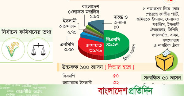 ভোটব্যাংকও বেড়েছে : নির্বাচন বিশ্লেষক আবদুল আলীম গণমাধ্যমকে বলেন, বিএনপির ফলটা কাক্সিক্ষত ছিল। আবার জামায়াতও রেকর্ড আসন পেয়েছে। তিনি বলেন, বিগত সরকারের সময় নিপীড়িত হওয়ায় এবং জনগণের সহানুভূতি পাওয়ায় দুটি দলের ভোট ব্যাংকই বিস্তৃত হয়েছে। আওয়ামী লীগবিহীন এ নির্বাচনে ভোটের হার ৬০ শতাংশ হলেও তা গ্রহণযোগ্য হয়েছে বলে মন্তব্য করেন তিনি। গেল তিন নির্বাচনের অনিয়ম তদন্তে গঠিত কমিশনের সদস্য আবদুল আলীম এবার বিএনপি ও জামায়াতের ভোট বাড়ার যুক্তি তুলে ধরে বলেন, একেক নেতার বিরুদ্ধে কয়েক শ করে মামলা, বিগত সময়ে অত্যাচার-অবিচার, তাতে বিএনপির প্রতি মানুষের সহমর্মিতা বাড়িয়ে দিয়েছিল। বিভিন্ন সময়ে দলটি ভাঙার চেষ্টা করেও সম্ভব হয়নি। প্রবাসে থেকে দল পরিচালনায় (চেয়ারপারসন অসুস্থ থাকা অবস্থায়) মূল দায়িত্ব তারেক রহমানকে (বর্তমান চেয়ারম্যান) পালন করতে হয়েছে। এ ছাড়া নানা বিষয়ে খালেদা জিয়ার ‘আপসহীন ভূমিকা’ ও নানা চাপ প্রত্যাখ্যান করার মতো বিষয় ভোটাররা ইতিবাচক হিসেবে নিয়েছে বলেও মনে করেন এ বিশ্লেষক। জামায়াতে ইসলামীর ভোট বাড়ার প্রসঙ্গ টেনে তিনি বলেন, গেল সরকারের আমলে দলটি নিষিদ্ধ করা হলো, তাদের নিবন্ধন বাতিল করা হল। এটাও বাংলাদেশের অনেক মানুষ ভালোভাবে নেয়নি। তারও একটা প্রভাব আমরা দেখতে পেলাম এ নির্বাচনে। কারণ জামায়াত ১৯৯১ সালের নির্বাচনে সর্বোচ্চ ১৮টি আসন পেয়েছিল। এবার সেটা ছাড়িয়ে রেকর্ড সংখ্যক (৬৮টি) আসনে তারা বিজয়ী হয়েছে। এখানে দুটো দলই অত্যাচার-নির্যাতন সহ্য করেছে, কাজেই জনসমর্থন দুই দলেই বেড়েছে। সংরক্ষিত নারী আসন ও জুলাই সনদের উচ্চকক্ষ : এবারের নির্বাচনে এখন পর্যন্ত ২৯৭ আসনের ফল ঘোষণা করা হয়েছে। এর মধ্যে বিএনপি জিতেছে ২০৯ আসনে; জামায়াতে ইসলামী পেয়েছে ৬৮টি আসন। জামায়াতের ১১ দলীয় জোটের শরিকদের মধ্যে এনসিপি ছয়টি, বাংলাদেশ খেলাফত মজলিস দুটি ও খেলাফত মজলিশ একটি আসন পেয়েছে। অন্যদিকে বিএনপির সঙ্গে থাকা গণঅধিকার পরিষদ একটি, বাংলাদেশ জাতীয় পার্টি-বিজেপি একটি ও গণসংগতি আন্দোলন একটি আসনে জয় পেয়েছে। জোটের বাইরে ইসলামী আন্দোলন বাংলাদেশ একটি ও স্বতন্ত্র প্রার্থীরা সাতটি আসনে জয় পেয়েছেন। ত্রয়োদশ সংসদে সংরক্ষিত ৫০ আসনের মধ্যে বিএনপি জোট পাবে ৩৬টি, জামায়াত জোট পাবে ১৩টি, আর স্বতন্ত্ররা পাবে একটি। দ্বিকক্ষ হলে উচ্চকক্ষ গঠন কীভাবে : জুলাই জাতীয় সনদ বাস্তবায়নের গণভোটে ‘হ্যাঁ’ জয় পেয়েছে। জুলাই সনদে দ্বিকক্ষ বিশিষ্ট পার্লামেন্টের প্রস্তাব রয়েছে। সে ক্ষেত্রে উচ্চকক্ষের সদস্য সংখ্যা হবে ১০০ জন। এ ক্ষেত্রে সংসদ নির্বাচনে রাজনৈতিক দলগুলোর প্রাপ্ত ভোটের সংখ্যানুপাতিক প্রতিনিধিত্ব বা পিআর পদ্ধতিতে উচ্