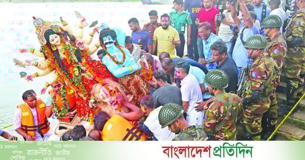 শুভ আগামীর প্রত্যয়ে দেবী দুর্গার প্রতিমা বিসর্জনের মধ্য দিয়ে শেষ হলো এবারের শারদ উৎসব। রাজধানীতে বিজয়াদশমী উদ্যাপন শেষে কড়া নিরাপত্তায় বুড়িগঙ্গা নদীতে প্রতিমা বিসর্জন দিয়েছেন সনাতন ধর্মাবলম্বীরা। বিজয়াদশমীতে সিঁধুর খেলা এবং দেবী দুর্গাকে বিসর্জনের মাধ্যমে শেষ হয় দুর্গোৎসবের মূল আনুষ্ঠানিকতা। পঞ্চম দিনে মর্ত্যলোক থেকে বিদায় নিয়েছেন দেবী দুর্গা।