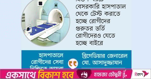 জাতীয় ক্যানসার গবেষণা ইনস্টিটিউট ও হাসপাতালে যন্ত্র নষ্ট থাকায় পাঁচ বছর ধরে এমআরআই পরীক্ষা বন্ধ আছে। কিছুদিন আগে নষ্ট হয়েছে ঢাকা মেডিকেল কলেজ হাসপাতালের এমআরআই মেশিনটিও। স্যার সলিমুল্লাহ মেডিকেল কলেজ ও মিটফোর্ড হাসপাতালের চক্ষু বিভাগে এক দশক ধরে অকেজো পড়ে আছে প্রায় ১১ কোটি টাকার ল্যাসিক মেশিন। জাতীয় হৃদরোগ ইনস্টিটিউট ও হাসপাতালে বাক্সবন্দি অবস্থায় পড়ে আছে বেশ কিছু যন্ত্র। শুধু ঢাকা নয়, বরিশাল, সাতক্ষীরাসহ বেশ কিছু জায়গায় যন্ত্র নষ্ট হয়ে পড়ে আছে। রাজশাহীতে পুরো হাসপাতালই অব্যবহৃত অবস্থায় পড়ে আছে। বেসরকারি ডায়াগনস্টিক সেন্টারে টেস্ট করাতে গিয়ে রোগী ও স্বজনদের গুনতে হচ্ছে কয়েক গুণ বেশি টাকা। জাতীয় ক্যানসার গবেষণা ইনস্টিটিউট ও হাসপাতাল সূত্রে জানা যায়, মেরামতের অভাবে পাঁচ বছর ধরে পড়ে আছে চীন থেকে উপহার পাওয়া এমআরআই মেশিন। এতে বাড়ছে ক্যানসার হাসপাতালে আসা রোগীদের ভোগান্তি। এর আগে নষ্ট হয়ে পড়ে ছিল সিটিস্ক্যান মেশিন। সম্প্রতি মেশিন মেরামত হলেও ফিল্মসংকটের কারণে খুব অল্প পরিমাণে টেস্ট হচ্ছে। ফলে দীর্ঘদিন অপেক্ষা করতে হচ্ছে টেস্ট করানোর জন্য। এতে ক্যানসার আক্রান্ত কিংবা উপসর্গ আছে এমন রোগীদের অবস্থার আরও অবনতি হচ্ছে। ঢাকা মেডিকেল কলেজ (ঢামেক) হাসপাতালে একটি এমআরআই মেশিন নষ্ট হয়ে পড়ে আছে। ফলে হাসপাতালে চিকিৎসা নিতে আসা রোগীদের প্রয়োজনীয় এমআরআই পরীক্ষা করানোর জন্য বাইরের ডায়াগনস্টিক সেন্টারে যেতে হচ্ছে। ভর্তি থাকা গুরুতর রোগীদেরও যেতে হচ্ছে বাইরে। ঢামেক হাসপাতালে এমআরআই করাতে খরচ হয় ২ হাজার ৫০০ থেকে ৩ হাজার ৫০০ টাকা। কিন্তু বাইরের প্রতিষ্ঠানে লাগে ৬ হাজার থেকে ১২ হাজার টাকা। জনি হোসেন নামে এক রোগী বলেন, ‘আমার পায়ের এমআরআই করাতে বলেছেন চিকিৎসক। কম খরচের জন্য সরকারি হাসপাতালে এসেছি। কিন্তু মেশিন নষ্ট থাকায় ফিরে যেতে হয়েছে। গত সপ্তাহেও একবার এসে ফিরে গেছি। এখন বাইরে থেকে দ্বিগুণ টাকায় টেস্ট করাতে হবে।’ ঢামেক হাসপাতালের পরিচালক ব্রিগেডিয়ার জেনারেল মো. আসাদুজ্জামান বাংলাদেশ প্রতিদিনকে বলেন, ‘হাসপাতালের এমআরআই যন্ত্র নষ্ট হয়েছে। এটা মেরামতের বিষয়ে ন্যাশনাল ইলেকট্রো-মেডিকেল ইকুইপমেন্ট মেইনটেন্যান্স ওয়ার্কশপ অ্যান্ড ট্রেনিং সেন্টারে জানানো হয়েছে। এটার মেরামত খরচ অনেক বেশি হওয়ায় অন্য হাসপাতালের বন্ধ মেশিন থেকে প্রয়োজনীয় যন্ত্র এনে দ্রুত সচল করার চেষ্টা হচ্ছে। রোগীর সেবা নিশ্চিতে আমরা সর্বোচ্চ চেষ্টা করছি।’