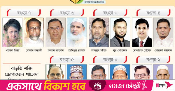 বগুড়া-৬ আসন (সদর) : বিএনপির চেয়ারপারসন ও সাবেক প্রধানমন্ত্রী বেগম খালেদা জিয়া ১৯৯৬ থেকে ২০০৮ সাল পর্যন্ত সব নির্বাচনে এই আসন থেকে বিপুল ভোটে জয়লাভ করেছেন। দেশের মধ্যে তিনি প্রতিবারই এই আসনে রেকর্ডসংখ্যক ভোট পেয়ে থাকেন। আসনটি বিএনপির জন্য ভিভিআইপি হিসেবে পরিচিত। তবে এবারের নির্বাচনে এ আসনে প্রথমবারের মতো দলীয়ভাবে প্রার্থী হয়েছেন দলের ভারপ্রাপ্ত চেয়ারম্যান তারেক রহমান। তিনি প্রার্থী হওয়ায় দলের সব নেতা-কর্র্মী মাঠে নেমেছেন। প্রতিদিনই চলছে ভোটের প্রচারণা কার্যক্রম। অনেকেরই ধারণা, বগুড়ায় এবার রেকর্ড পরিমাণ ভোট পাবেন তারেক রহমান।