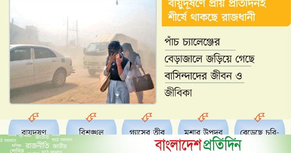 বায়ুদূষণে প্রায় প্রতিদিনই শীর্ষে থাকছে রাজধানী ঢাকার নাম। শব্দদূষণে ঝালাপালা কান। ওয়াসার পানির পাইপ দিয়ে মাঝে মাঝেই বের হয় ময়লা-দুর্গন্ধযুক্ত পানি। জার ও বোতলের পানিতে ভেসে বেড়ায় মলের জীবাণু। নানামুখী আন্দোলন আর বিশৃঙ্খল গণপরিবহনে প্রায় প্রতিদিন যানজটে ভুগছে নগরবাসী। দিনভর গ্যাসের তীব্র সংকটে জ্বলছে না রান্নার চুলা। এর মধ্যে দিনে-রাতে মশার কামড়ে অতিষ্ঠ হচ্ছে মানুষ। এই পাঁচ চ্যালেঞ্জের বেড়াজালে জড়িয়ে গেছে রাজধানীবাসীর জীবন ও জীবিকা।