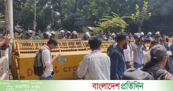 ‘ঢাকা সেন্ট্রাল ইউনিভার্সিটি আইন-২০২৫’ দ্রুত চূড়ান্ত করে অধ্যাদেশ জারির দাবিতে শিক্ষা ভবনের সামনে অবস্থান কর্মসূচি পালন করছেন সরকারি সাত কলেজের শিক্ষার্থীরা। সোমবার (১৩ অক্টোবর) সকালে সাত কলেজের বিভিন্ন প্রতিষ্ঠান থেকে মিছিল নিয়ে শিক্ষার্থীরা শিক্ষা ভবনের সামনে অবস্থান নেন। এতে করে সচিবালয় অভিমুখী সড়কে যান চলাচল বন্ধ হয়ে যায়। আর শিক্ষার্থীদের অগ্রসর হওয়া ঠেকাতে সেখানে ব্যারিকেড বসিয়েছে পুলিশ।