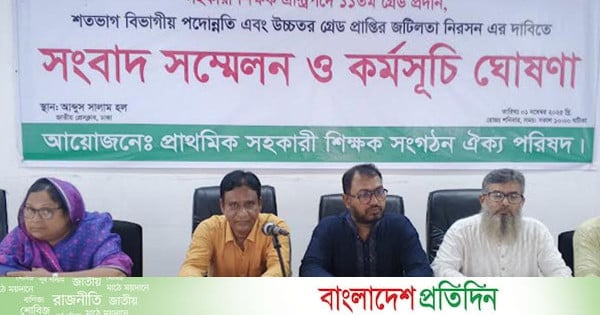 সহকারী শিক্ষক এন্ট্রিপদে ১১তম গ্রেড প্রদান, শতভাগ বিভাগীয় পদোন্নতি এবং উচ্চতর গ্রেড প্রদানের জটিলতা নিরসনের দাবিতে আন্দোলনের ঘোষণা দিয়েছে প্রাথমিক সহকারী শিক্ষক সংগঠন ঐক্য পরিষদ।