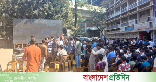 টিএসসিতে অন্যদের সঙ্গে ডাকসুর সাহিত্য ও সংস্কৃতি বিষয়ক সম্পাদক মোসাদ্দেক আলী ইবনে মোহাম্মদ এবং সমাজসেবা সম্পাদক এ বি জুবায়ের উপস্থিত রয়েছেন।