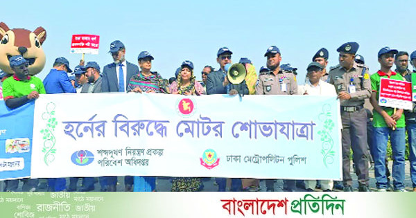 পরিবেশ অধিদপ্তরের বাস্তবায়নাধীন ‘শব্দদূষণ নিয়ন্ত্রণে সমন্বিত ও অংশীদারিত্বমূলক প্রকল্প’-এর আওতায় শব্দদূষণ নিয়ন্ত্রণে জনসচেতনতা বৃদ্ধির লক্ষ্যে পরিবেশ অধিদপ্তর এবং ঢাকা মেট্রোপলিটন পুলিশের (ডিএমপি) যৌথ উদ্যোগে ‘হর্নের বিরুদ্ধে মোটর শোভাযাত্রা’ গতকাল অনুষ্ঠিত হয়েছে। এতে উপস্থিত ছিলেন পরিবেশ উপদেষ্টা সৈয়দা রিজওয়ানা হাসান, মন্ত্রণালয়ের সচিব ড. ফারহিনা আহমেদ, অধিদপ্তরের মহাপরিচালক ড. মো. কামরুজ্জামান, ঢাকা মেট্রোপলিটন পুলিশের অতিরিক্ত পুলিশ কমিশনার (অ্যাডমিন) মো. সরওয়ার প্রমুখ। উল্লেখ্য, প্রকল্পের আয়োজনে ৫ জানুয়ারি থেকে শব্দদূষণ নিয়ন্ত্রণে ঢাকার ১০ পয়েন্টে মোবাইল কোর্ট ও ক্যাম্পেইন পরিচালনা করা হয়েছে; যা গতকাল মোটর শোভাযাত্রার মধ্য দিয়ে শেষ হয়। বিজ্ঞপ্তি