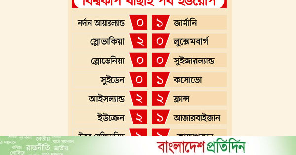 আসন্ন ফিফা ফুটবল বিশ্বকাপের মূল পর্বে জায়গা করে নিতে লড়াই করছে বিভিন্ন অঞ্চলের দলগুলো। ইতোমধ্যে ৪৮ দেশের মূল পর্বের লড়াইয়ের জন্য ২২টি দেশের খেলা নিশ্চিত হয়েছে। বাকি আছে ২৭টি জায়গা। যার জন্য এখনো লড়াইয়ে রয়েছে ৭৬টি দেশ। ১১২টি দেশ ইতোমধ্যে বিদায় নিয়েছে। তবে ইউরোপ অঞ্চল থেকে এখনো কোনো দল যোগ্যতা অর্জন করেনি। এখনো চলছে বাছাই পর্বের খেলা। সেখান থেকে সরাসরি ১৬টি দল যোগ্যতা অর্জন করবে। এখন পর্যন্ত প্রত্যাশিত দলগুলোই গ্রুপের শীর্ষস্থান ধরে রেখেছে। সোমবার রাতে অ্যাওয়ে ম্যাচে নর্দান আয়ারল্যান্ডকে ১-০ গোলে হারিয়েছে সাবেক চ্যাম্পিয়ন জার্মানি। একমাত্র গোলটি করেন নিক ভল্টামাডা। সেপ্টেম্বরে হোম ম্যাচেও ৩-১ গোলে জিতেছিল জার্মানি। এ জয়ে ৯ পয়েন্ট নিয়ে এ-গ্রুপের শীর্ষে আছে তারা। এদিকে বাছাইপর্বে টানা তিন জয়ের পর প্রথমবারের মতো পয়েন্ট হারাল ফ্রান্স। সোমবার রাতের ম্যাচে আইসল্যান্ডের মাঠে ২-২ গোলে ড্র করেছে দুবারের সাবেক বিশ্ব চ্যাম্পিয়নরা। পয়েন্ট হারালেও ডি-গ্রুপের শীর্ষস্থান ধরে রেখেছে ফ্রান্স। ৪ ম্যাচে ১০ পয়েন্ট তাদের। এ ছাড়া বি-গ্রুপে সুইজারল্যান্ড, সি-ডেনমার্ক, ই-স্পেন, এফ-পর্তুগাল, জি-নেদারল্যান্ডস, এইচ-অস্ট্রিয়া, আই-নরওয়ে, জে-বেলজিয়াম, কে-ইংল্যান্ড ও এল-গ্রুপের শীর্ষে অবস্থান করছে ক্রোয়েশিয়া।