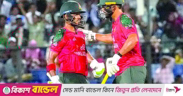 হোয়াইটওয়াশ এড়ানোর ম্যাচে লিটন বাহিনী খেলেছে একাদশে চার পরিবর্তন নিয়ে। পূর্ব ধারণা মতো বাদ পড়েছেন বাঁ-হাতি ব্যাটার শামীম হোসেন পাটোয়ারী। যিনি সর্বশেষ ১০ ম্যাচে চারটি শূন্য করেছেন। টানা খেলার ক্লান্তি এড়াতে বিশ্রাম দেওয়া হয় বাঁ-হাতি কাটার বোলার মুস্তাফিজুর রহমানকে। ছন্দ হারানোয় বাদ পড়েছেন তাওহিদ হৃদয়। বিশ্রাম দেওয়া হয়েছে আরেক ফাস্ট বোলার তানজিদ সাকিবকে। তাদের পরিবর্তে একাদশে সুযোগ পেয়েছেন বাঁ-হাতি পেসার শরিফুল ইসলাম, ওপেনার পারভেজ হোসেন ইমন, উইকেটরক্ষক ব্যাটার নুরুল হাসান সোহান ও স্পিন অলরাউন্ডার শেখ মেহেদি হাসান। সিরিজে এই প্রথম টস জিতে ব্যাটিং করে লিটন বাহিনী। আগের দুই ম্যাচে টাইগাররা হেরেছিল যথাক্রমে ১৬ ও ১৪ রানে। গতকাল ফ্লাইড লাইটে দুই বাঁ-হাতি ওপেনার তানজিদ ও পারভেজ ১৯ বলে ২২ রানের জুটি গড়ে বিচ্ছিন্ন হন। সিরিজে প্রথমবার খেলতে নেমে ব্যর্থ হয়েছেন পারভেজ। আউট হয়েছেন ৯ রানে। অধিনায়ক লিটনও ৬ রানের বেশি করতে পারেননি। ৪৪ রানে ২ উইকেট পতনের পর জুটি গড়েন তানজিদ ও সাইফ হাসান। আগের দুই ম্যাচে ওপেন করা সাইফ গতকাল ৪ নম্বরে ব্যাট করেন। দুজনে ৭.১ ওভারে ৬৩ রান যোগ করেন স্কোর বোর্ডে। সাইফ ২৩ রানে সাজঘরে ফেরেন। তানজিদ আউট হন ২০ নম্বর ওভারের প্রথম বলে। তানজিদ ৮৯ রানের ইনিংস খেলেন ৬২ বলে ৯ চার ও ৪ ছক্কায়। বাঁ-হাতি ওপেনার তানজিদ ও সাইফ ছাড়া আর কোনো ব্যাটার দুই অংকের স্কোর করতে পারেননি।