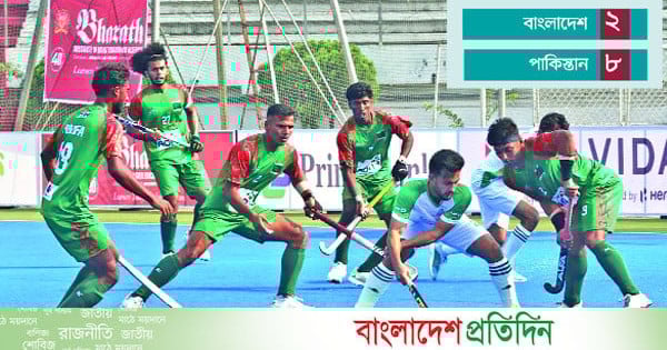 চোখে আঙুল দিয়ে হকিতে বাংলাদেশের অবস্থানটা দেখিয়ে দিল পাকিস্তান। গতকাল তিন ম্যাচ হকি সিরিজের প্রথম ম্যাচে মওলানা ভাসানী স্টেডিয়ামে সিগফ্রাইড আইকম্যানের শিষ্যদের ৮-২ গোলে উড়িয়ে দিয়েছে সফরকারী পাকিস্তান। সিরিজ শুরুর আগে পাকিস্তানের চোখে চোখ রেখে সমানতালে লড়াইয়ের কথা দিয়েছিল বাংলাদেশ। কিন্তু পাকিস্তানের কাছে পাত্তাই পেলেন না রেজাউল করিম বাবুরা। ম্যাচজুড়ে পাকিস্তানের পেনাল্টি কর্নার সামলাতেই হিমশিম খেয়েছেন তারা। হঠাৎ আক্রমণে হুজায়ফা একটি গোল করেন। আমিরুল ইসলাম আরেকটি গোল করেন পেনাল্টি কর্নার থেকে। অনূর্ধ্ব-২১ দলের এ দুজনের দুটি গোল ছাড়া ম্যাচে বাংলাদেশের তেমন কিছুই ছিল না। বিপরীত দিকে পাকিস্তানের পক্ষে আরফাজ ও নাদিম দুটি করে গোল করেন। এ ছাড়া একটি করে গোল করেন আম্মাদ ভাট, গজনফার, শহীদ হান্নান ও রানা ওয়াহিদ। ম্যাচের চার মিনিটে বাংলাদেশের রক্ষণের রোমান সরকার প্রতিপক্ষের স্টিকের আঘাতে মাথায় আঘাত পান। নীল টার্ফে রক্তও ঝরেছে। সেই রক্ত মুছতে পানি ঢালতে হয়েছে। রক্তাক্ত হয়ে চেষ্টা করলেও পরাজয় এড়াতে পারেননি রোমানরা। তিন ম্যাচ সিরিজের দ্বিতীয়টি আজ। তৃতীয় ম্যাচ হবে রবিবার। সব ম্যাচই হচ্ছে মওলানা ভাসানী হকি স্টেডিয়ামে।