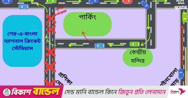 ম্যাচ চলাকালীন এ পথে চলাচলকারী সবাইকে প্রশিকা মোড় থেকে ডানে মোড় নিয়ে রাইনখোলা-সনি স্কয়ার হয়ে বিকল্প পথে চলাচল করার জন্য অনুরোধ জানিয়েছে ডিএমপি।