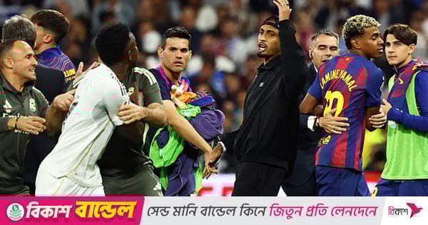 এল ক্লাসিকোর মতো দ্বৈরথে কথার লড়াইয়ের সঙ্গে খানিকটা শরীরি লড়াই থাকবে, সেটাই তো স্বাভাবিক। লিওনেল মেসি-ক্রিশ্চিয়ানো রোনালদোর সময়কার চিরপ্রতিদ্বন্দ্বি দুই ক্লাবের ফুটবলাররা তো প্রায়ই হাতাহাতিতে জড়িয়ে পড়ত। লামিনে ইয়ামাল-কিলিয়ান এমবাপে যুগের দ্বৈরথেও দেখা গেল আগের সেই উত্তাপ।