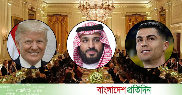 যুক্তরাষ্ট্রের প্রেসিডেন্ট ডোনাল্ড ট্রাম্প ও সৌদি আরবের যুবরাজ মোহাম্মদ বিন সালমানের উপস্থিতিতে হোয়াইট হাউসের এক বিশেষ নৈশভোজে যোগ দিয়েছেন ফুটবল ইতিহাসের অন্যতম সেরা তারকা ক্রিস্টিয়ানো রোনালদো। বিশ্বের প্রভাবশালী নেতা এবং ব্যবসায়ীদের এই মিলনমেলায় রোনালদোর উপস্থিতি ছিল বিশেষ আকর্ষণের কেন্দ্রবিন্দু।