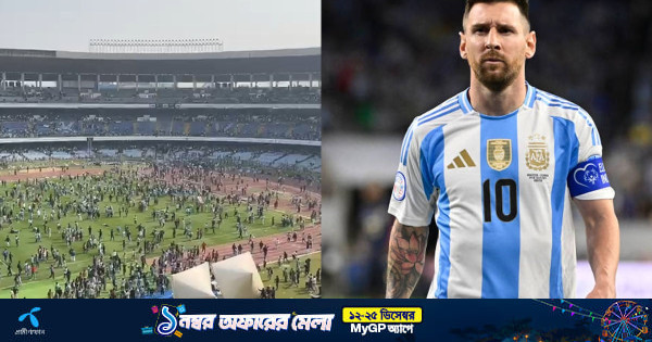 শনিবার সকালে যুবভারতী স্টেডিয়ামে পা রাখতেই গ্যালারি কানায় কানায় পূর্ণ হয়ে ওঠে। কিন্তু দীর্ঘ অপেক্ষার পরও মেসির মাঠ প্রদক্ষিণ বা কাছ থেকে দর্শনের সুযোগ না পেয়ে একাংশ দর্শক ক্ষুব্ধ হয়ে ওঠেন। রেলিং ভেঙে মাঠে ঢুকে পড়া, চেয়ার ও পানির বোতল ছোড়া- সব মিলিয়ে রীতিমতো রণক্ষেত্রের রূপ নেয় স্টেডিয়াম।