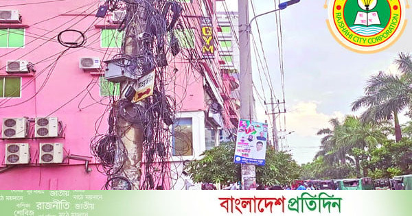 রাজশাহী মহানগরীর বিভিন্ন গুরুত্বপূর্ণ সড়ক, বাজার ও আবাসিক এলাকায় মাথার ওপর জটলা পাকিয়ে ঝুলছে বিদ্যুৎ, ইন্টারনেট ও ক্যাবল টিভির অসংখ্য তার। কোনো পরিকল্পনা বা সমন্বয় ছাড়া বছরের পর বছর সংযোগ নেওয়ায় সৃষ্টি হয়েছে ‘তারের জঞ্জাল’। নগরবাসীর অভিযোগ, এটি শুধু শহরের সৌন্দর্য নষ্ট করছে না, বরং বড় ধরনের দুর্ঘটনার ঝুঁকিও তৈরি করছে।